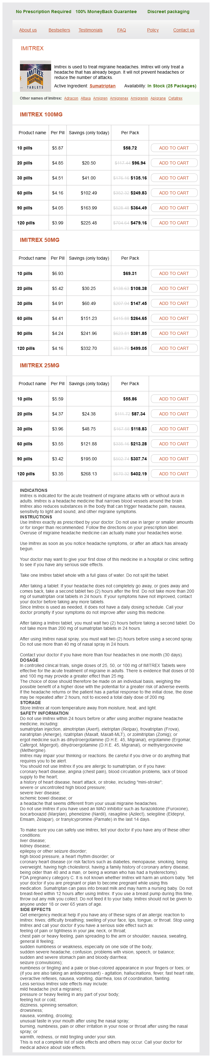 Imitrex dosages: 100 mg, 50 mg, 25 mg